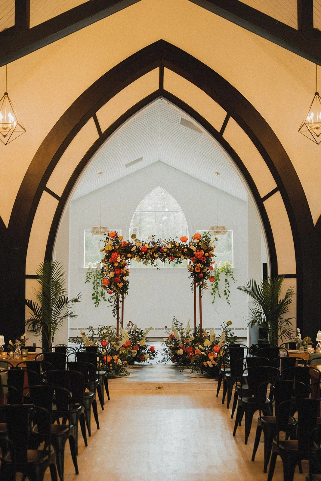Inside Pocono Palms’ stunning chapel-style venue, the couple exchanged vows under a breathtaking floral arch overflowing with coral, pink, and yellow blooms. The natural light streaming through the arched windows highlighted the vibrant design, bringing the perfect balance of elegance and playfulness to their ceremony.