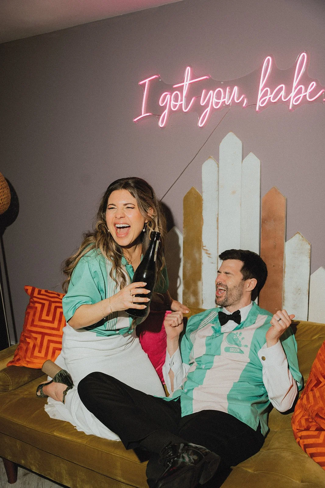 From their first kiss to the last toast, this couple made the day completely their own. Before wrapping up the celebration at Pocono Palms, the couple celebrated their marriage under the “I got you, babe” neon sign hanging at Pocono Palms. Wearing their custom bowling shirts, the couple headed to their afterparty that was hosted at the local bowling alley.