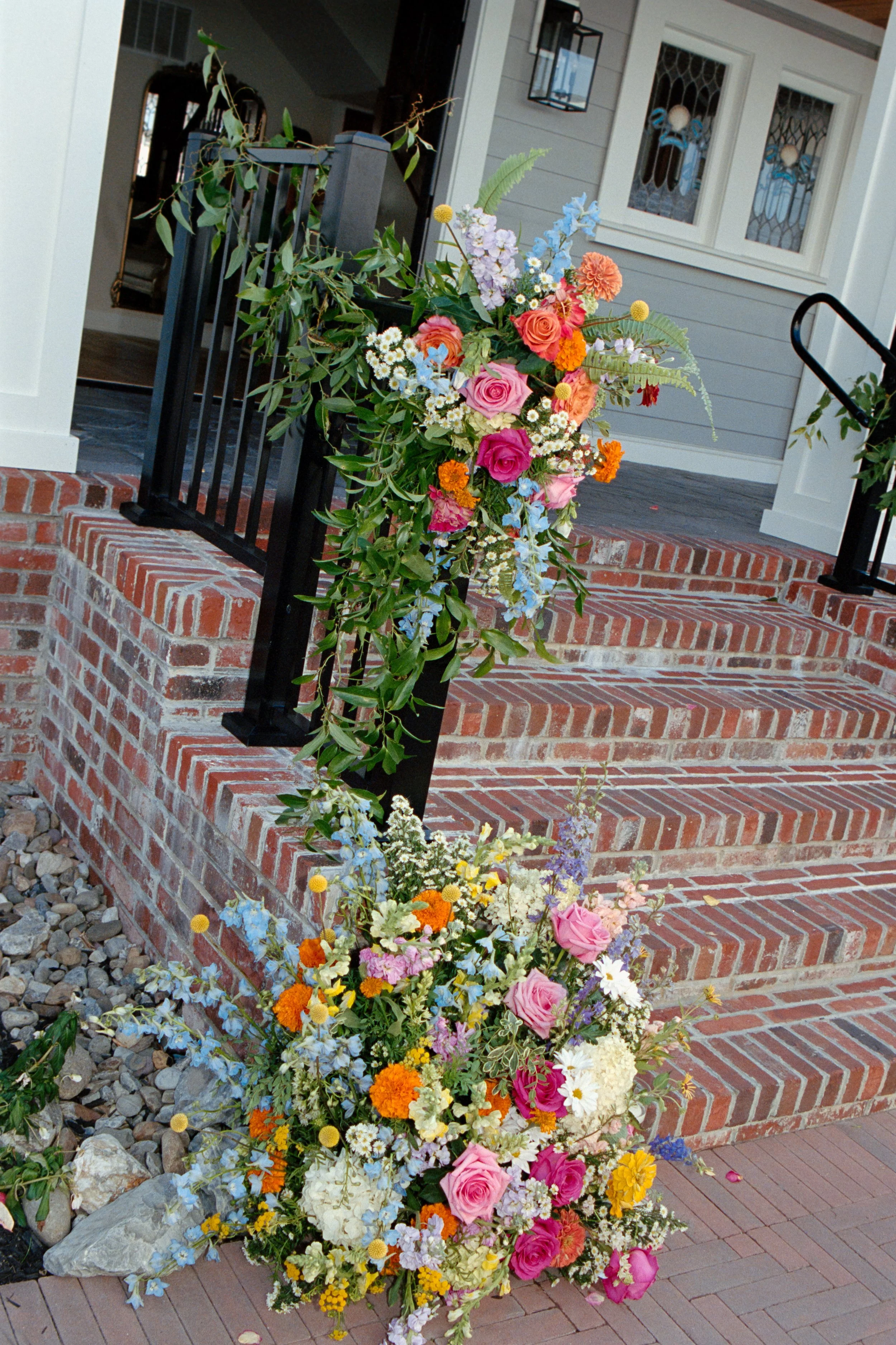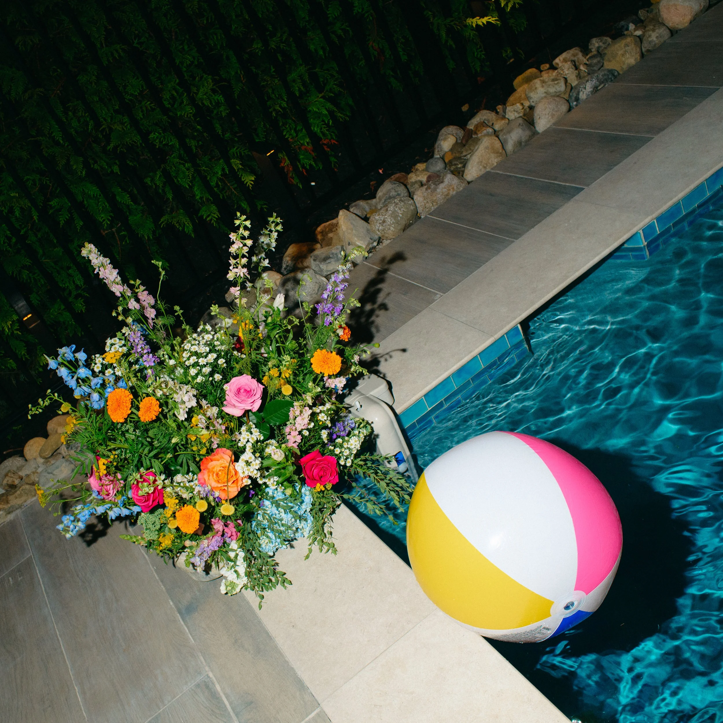 As a partial planning and design concepts client, this couple trusted me to bring their vision to life while keeping the day stress-free. We leaned into bold, summer-inspired florals — pops of pink, orange, yellow, and blue created a cheerful palette that perfectly complemented the playful coastal setting. From lush floral installs at the ceremony entrance to whimsical arrangements by the pool, every detail felt alive and full of love.