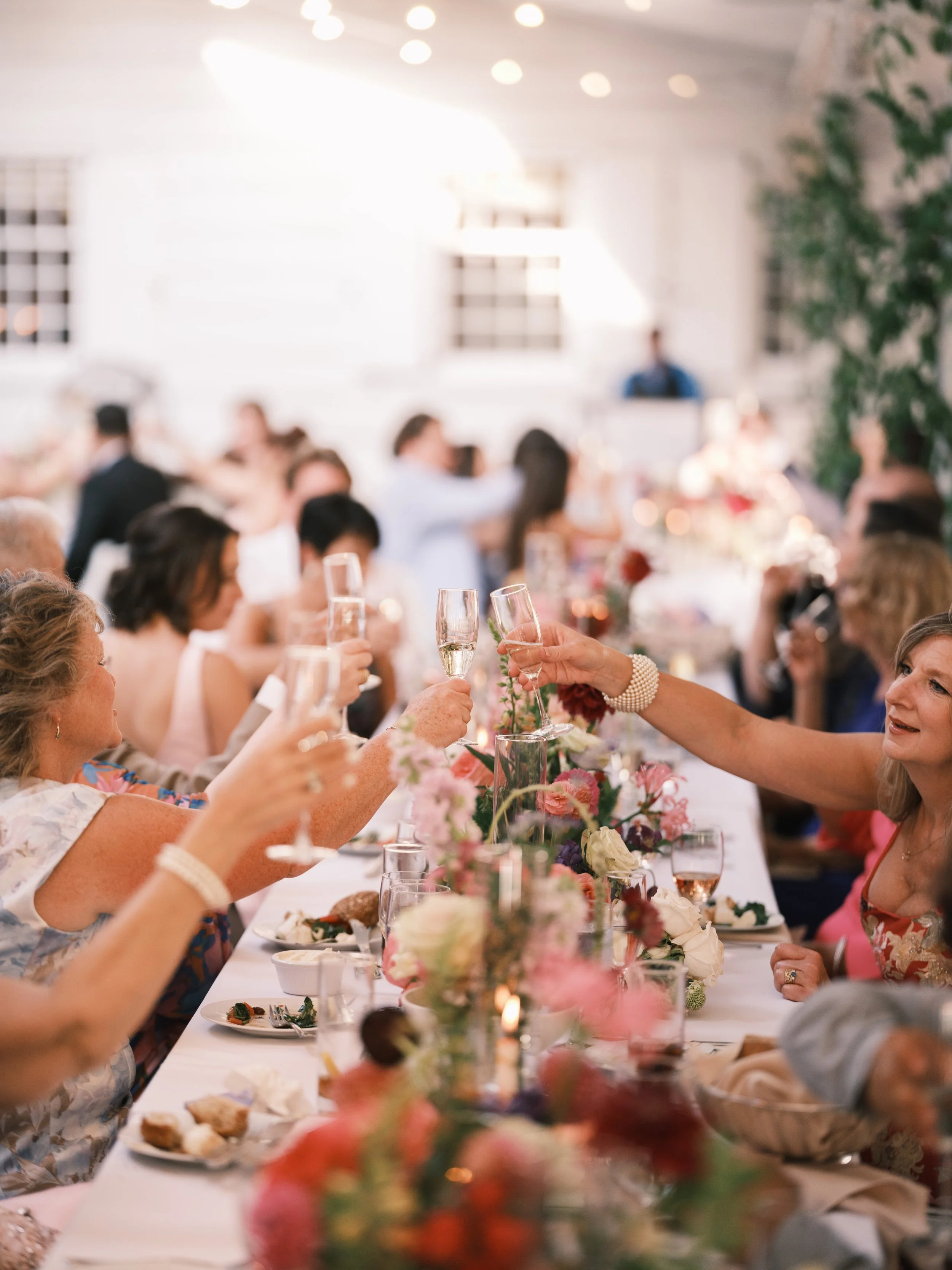 As the sun began to set, the celebration moved into an evening of joy, laughter, and heartfelt toasts. Long tables lined with seasonal florals, flickering candles, and glowing bistro lights set the stage for a reception full of love and community.