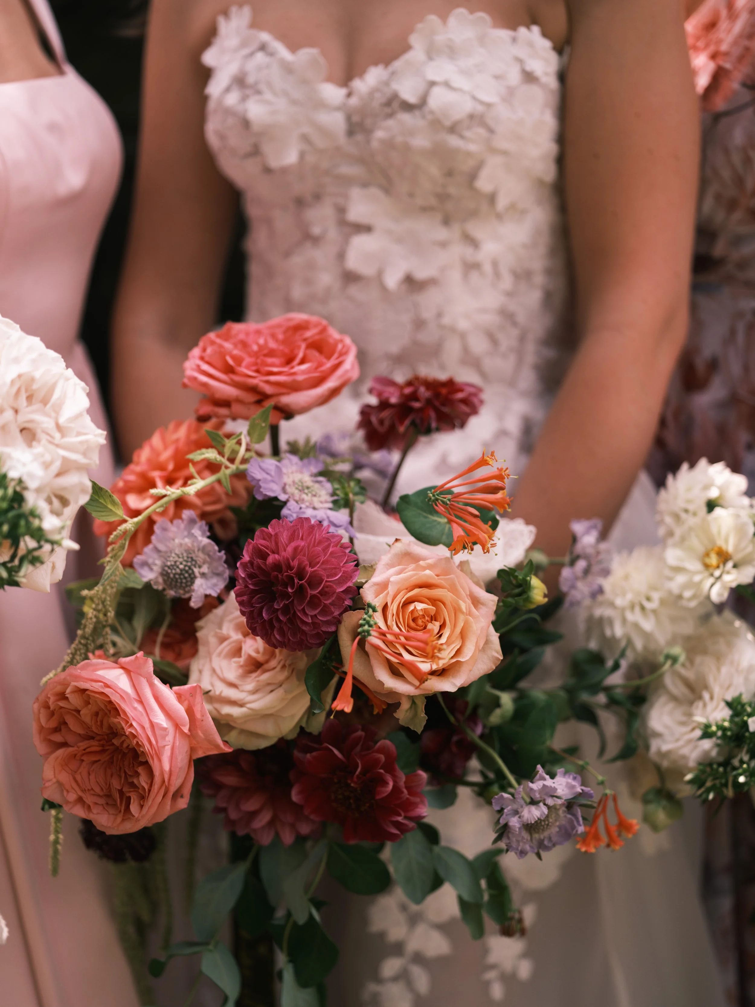Set in a lush garden backdrop, the ceremony blended timeless tradition with whimsical floral details. The bridal bouquet, filled with lush roses, dahlias, and textured greenery, complemented the bridesmaids’ soft, romantic dresses in blush and floral tones.