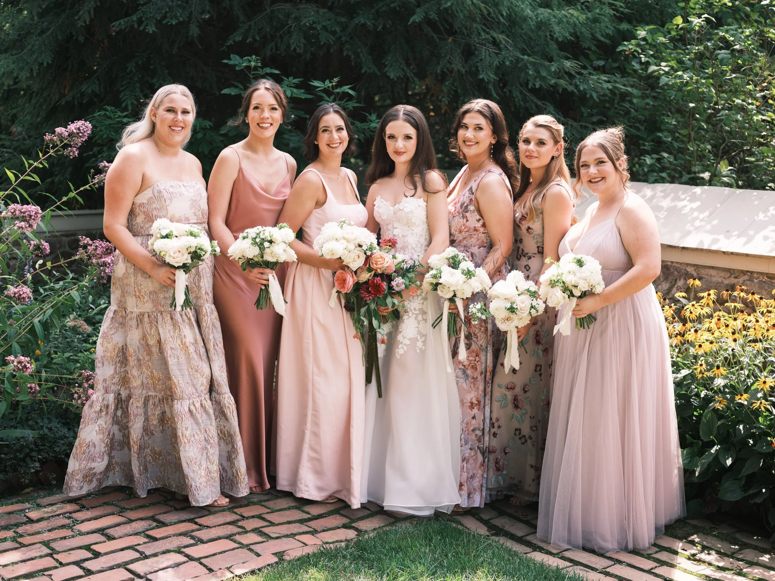 The bridesmaids looked stunning in a mix of blush, floral, and soft pink gowns — perfectly complementing the overall garden aesthetic. Together, they brought an effortless, cohesive look that still allowed each personality to shine.